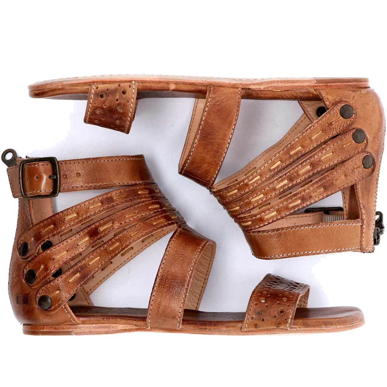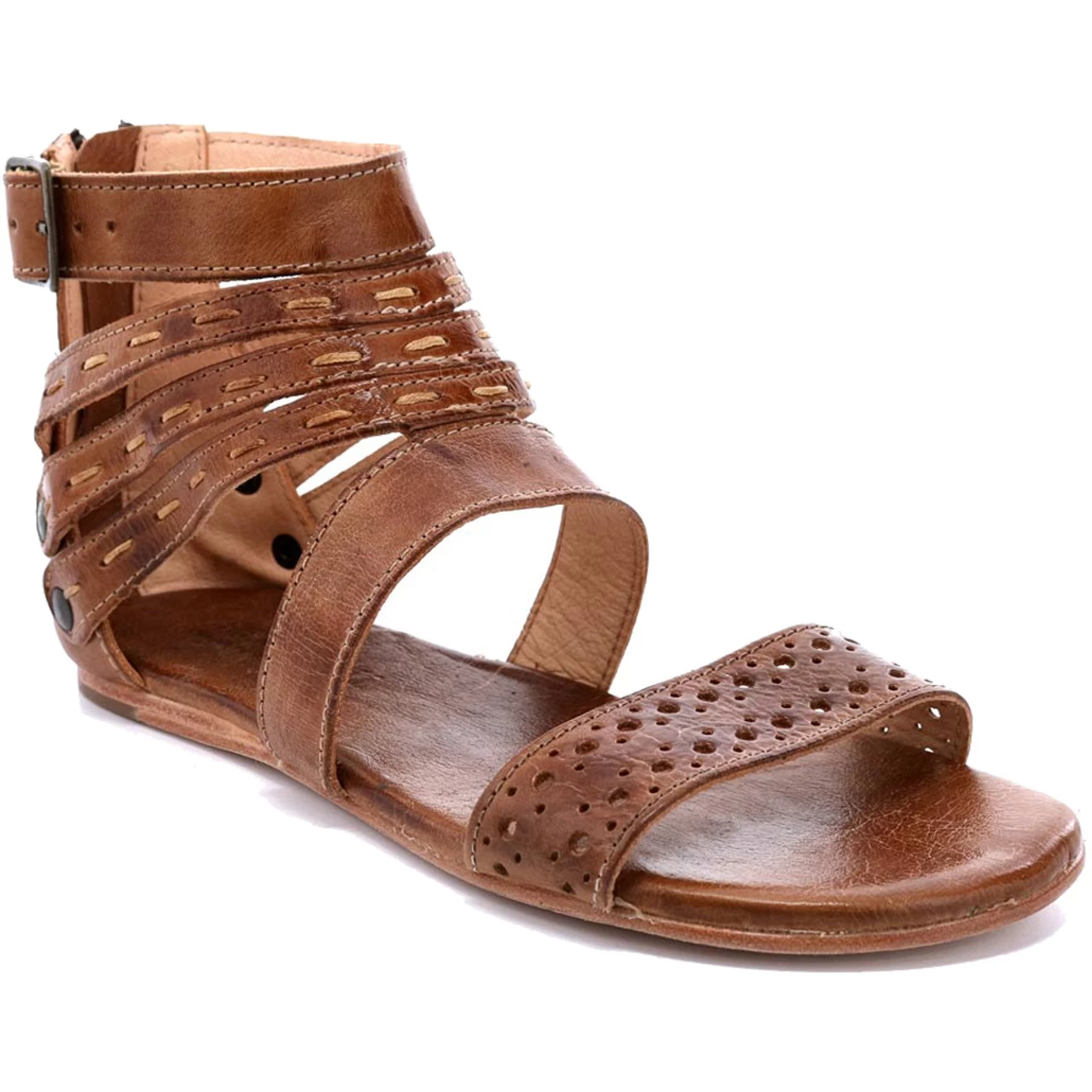 This playfully designed gladiator sandal has a padded leather foot bed for a comfortable step, an interesting strappy upper, and a rear zip for easy on-and-off.